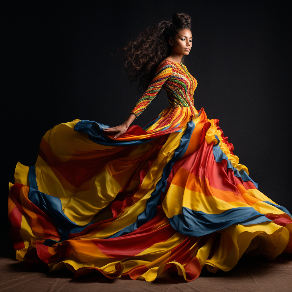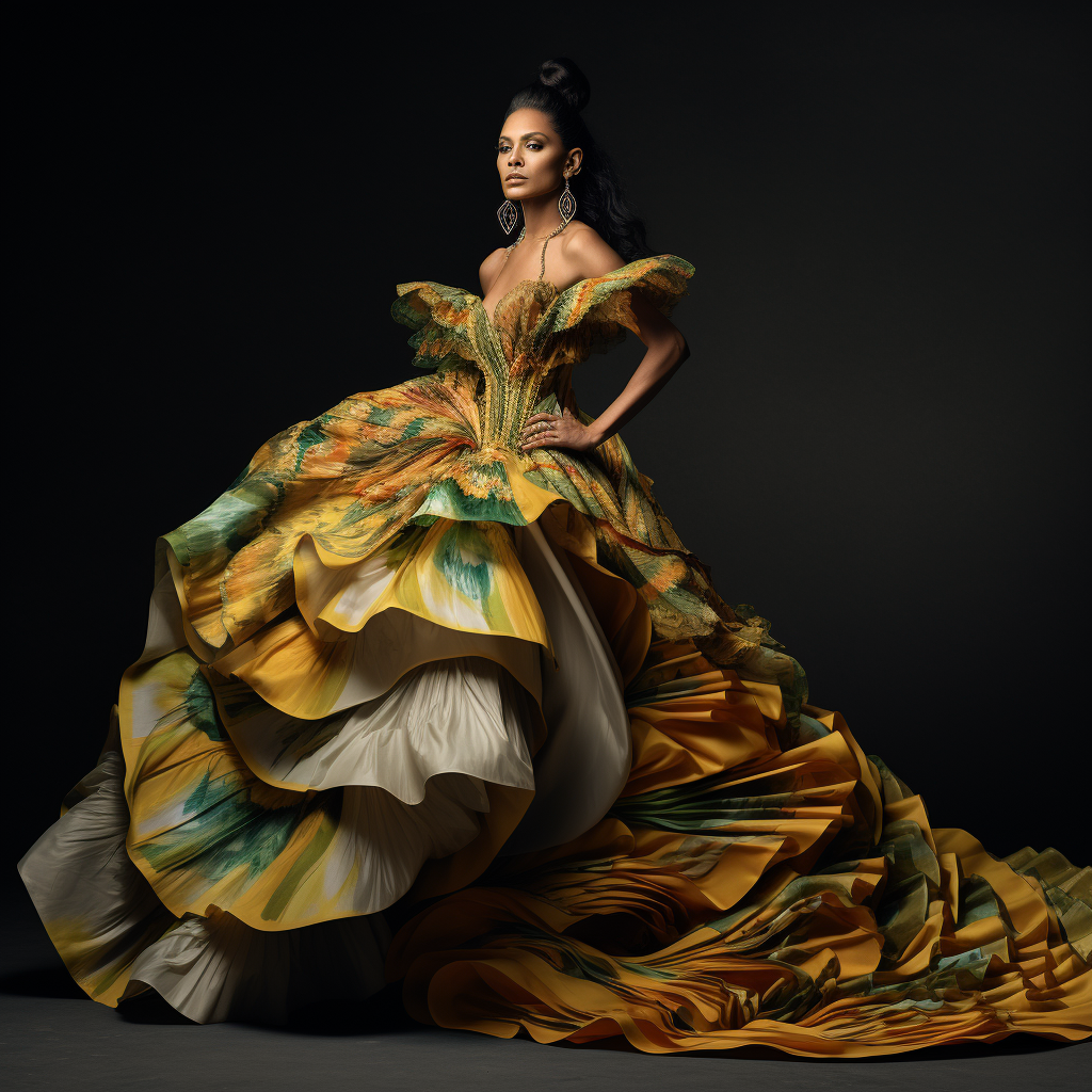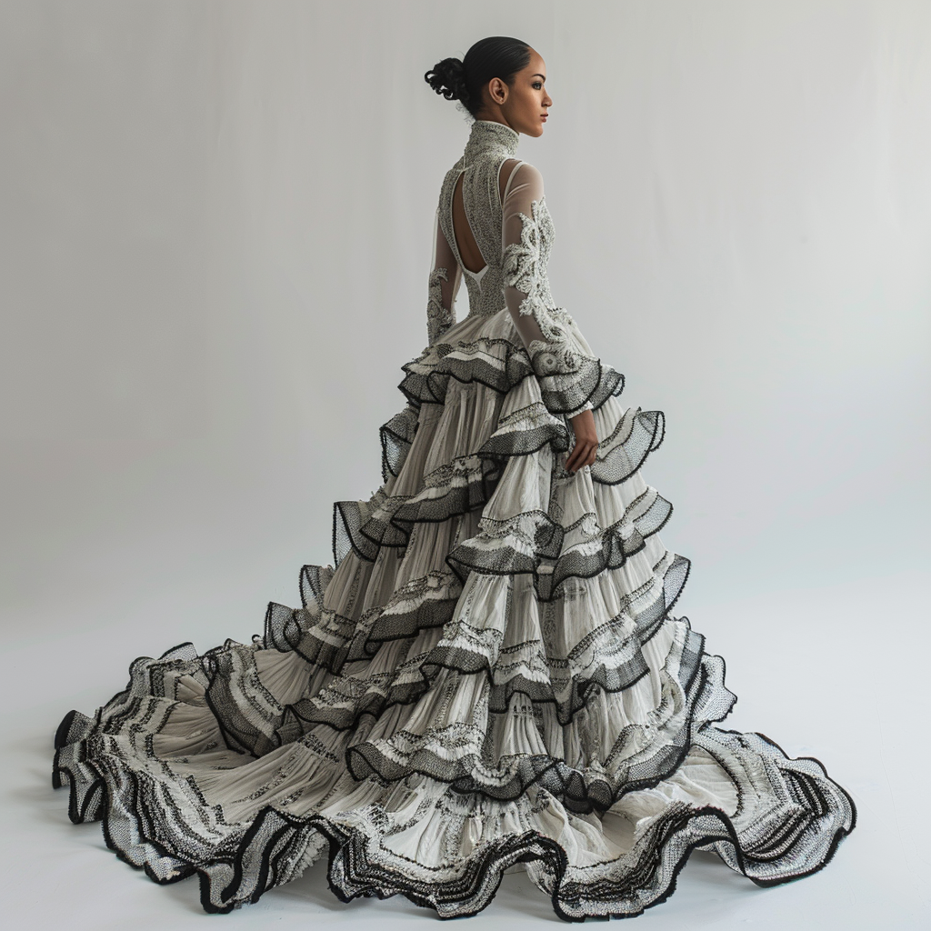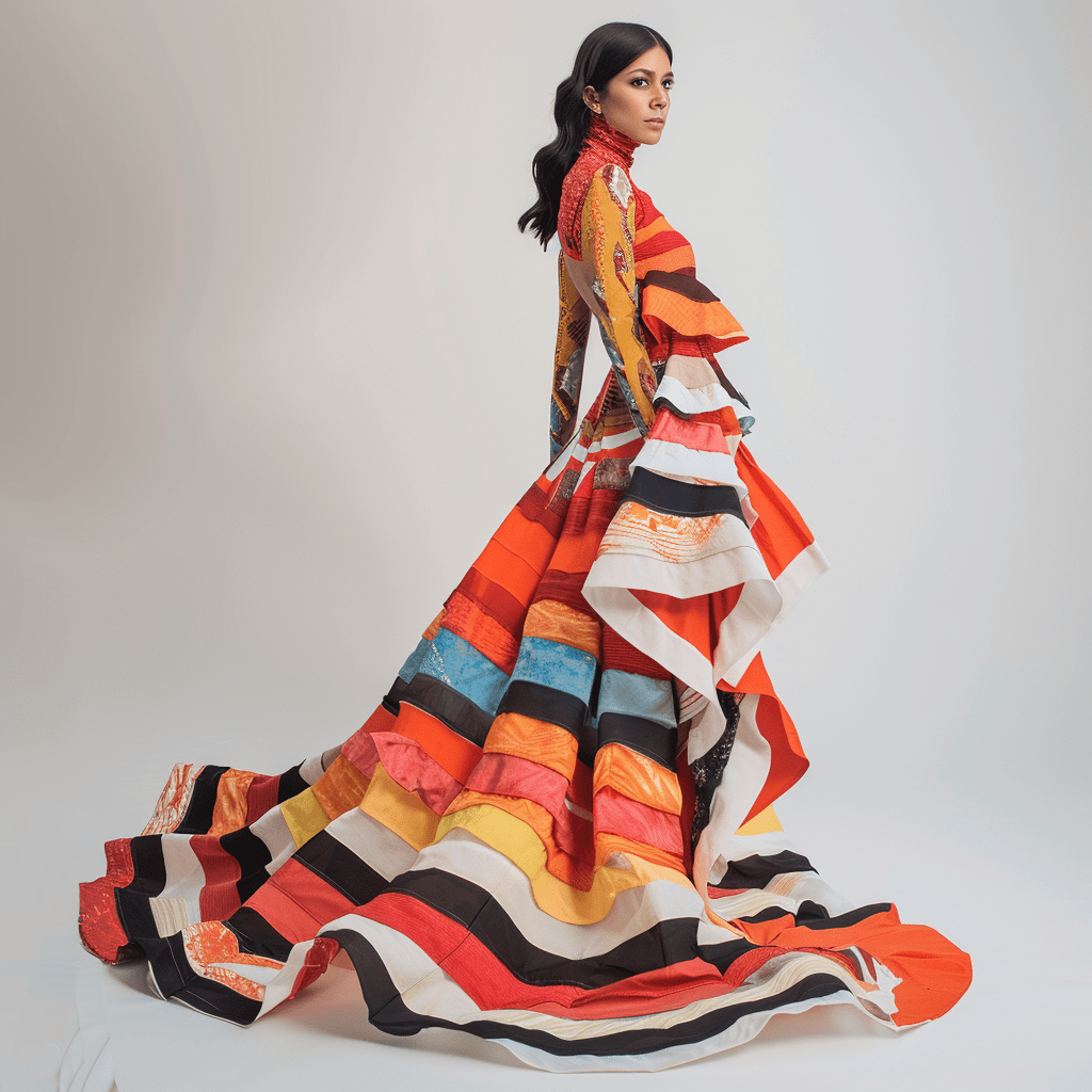 Los Andes ecuatorianos son conocidos por su rica tradición textil. Los diseñadores han tomado elementos de esta herencia, incorporando tejidos hechos a mano, bordados intrincados y una gama de colores vibrantes que reflejan los paisajes montañosos y la vida rural andina. Los vestidos de esta colección son una fusión de modernidad y tradición, mostrando patrones geométricos y simbología indígena.